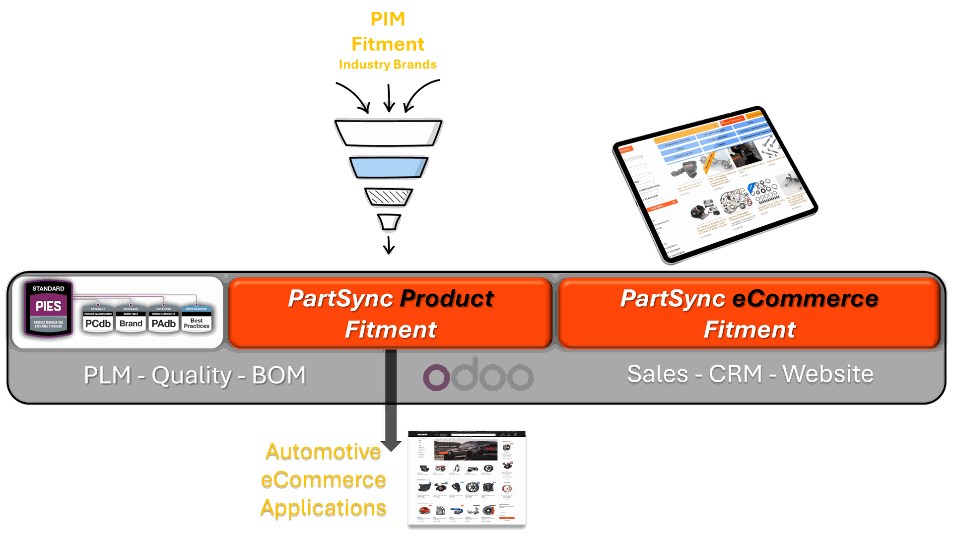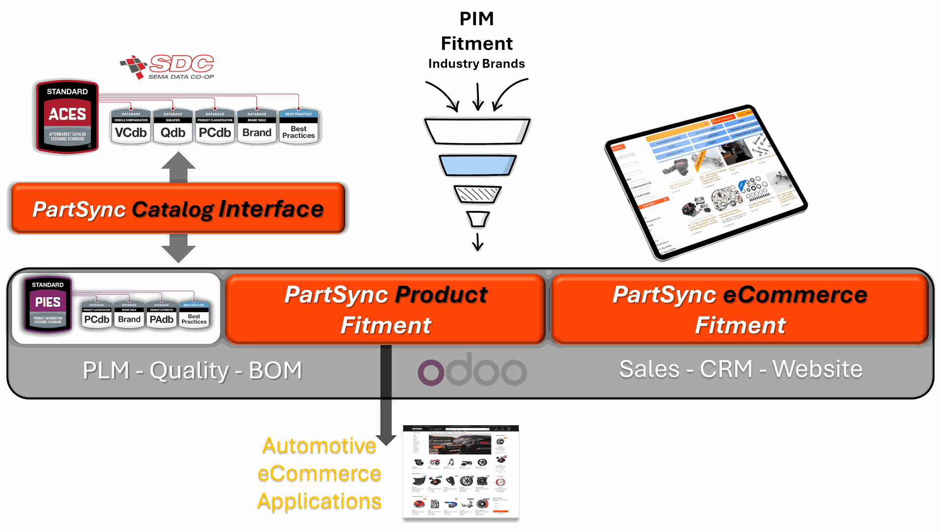 PartSync PPF, PEF for Odoo is a suite of software applications for Odoo ERP that provides built-in ACES and PIES standardization and formatting that also enhances Odoo’s ERP functionality making it specifically built to meet the unique data and eCommerce requirements of the automotive aftermarket industry. Now, automotive aftermarket manufacturers, distributors or dealers of any size and budget can now compete and streamline its operations with a fully functional ERP, with ACES and PIES compliant parts data, that streamlines their integration between its Odoo ERP and its eCommerce platform.